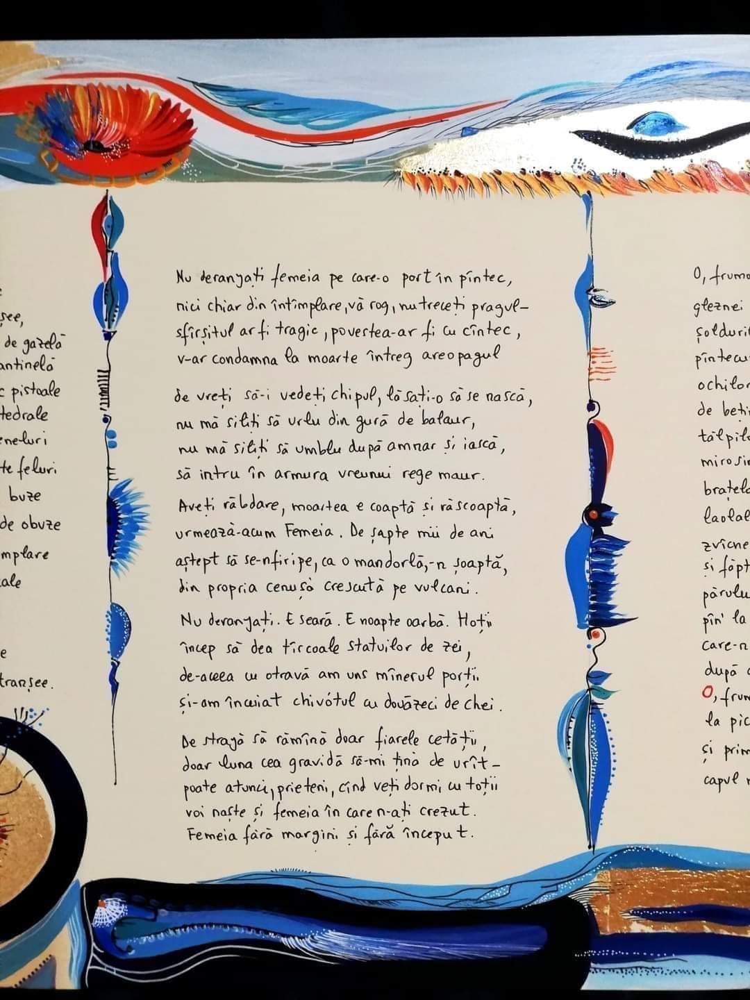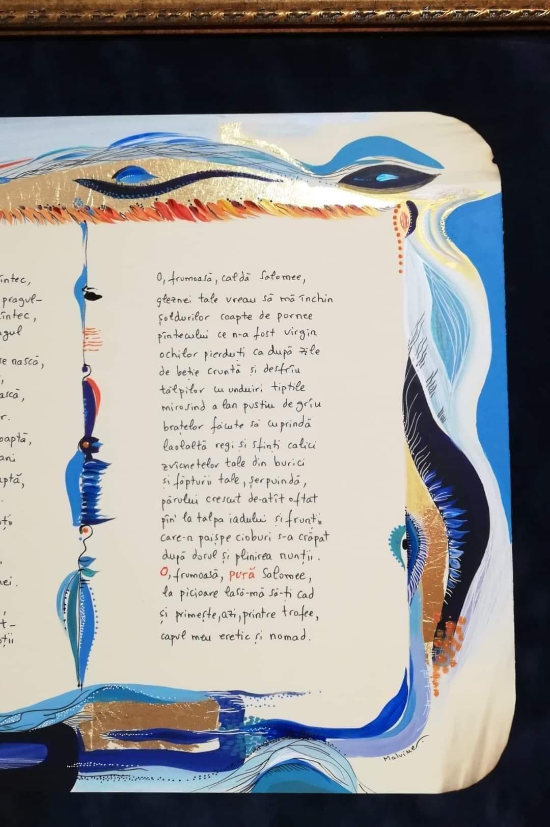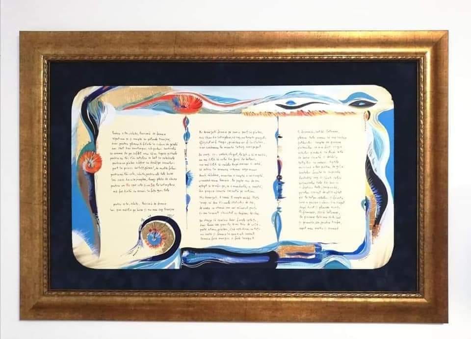 Pictură & poeme pe carton. Passe-partout de catifea și foiță de aur. Titlurile poemelor: „Cîntec”; „Femeia fără început”; „Trofeul”. 95/65 cm.